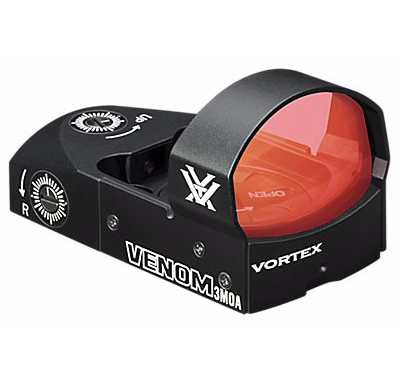 Vortex® Venom Reflex Sight provides rapid target acquisition and pinpoint accuracy. The Venom mounts on tactical rifles, shotguns, and handguns with Picatinny rails. The 3MOA dot is easy to pickup in any light and is capable of accurate shooting at long range. The ultra-clear lenses are fully multi-coated, providing a wide field-of-view, with sharp image quality, allowing user to keep both eyes open and focused on the target. Simple brightness controls are rapidly accessible on the left side of the unit. The CR 1632 battery loads on top of the sight eliminating the need to remove the sight to change batteries. A 14-hour auto-shutdown maintains a long battery life. The Vortex Venom Reflex Sight is constructed with a durable, machined aluminum housing to ensure the unit stands up to harsh tactical environments. Shockproof and waterproof.